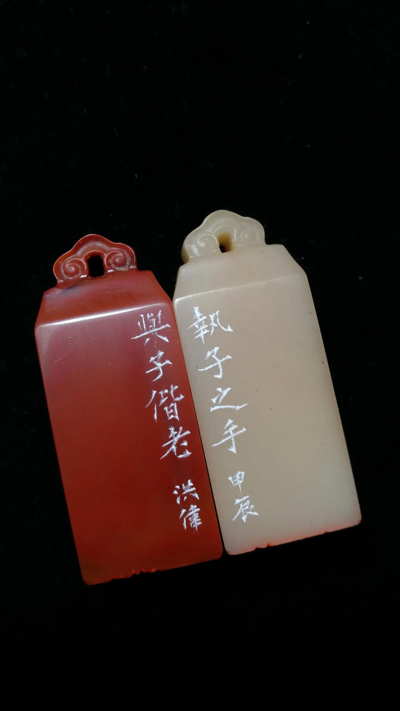 结婚纪念章,广州老友为弟弟结婚嘱刻。 石上阴阳镌凤契,人间岁月证龙纹。这对印章,