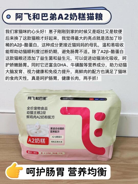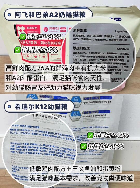 •阿飞和巴弟 A2奶糕幼猫粮:主打A2奶源,成分表前三位是鲜鸡肉、A2奶源、有机大米,蛋白质含量高达36%,适合幼猫发育期。A2奶源更容易消化,对肠胃脆弱的幼猫很友好。