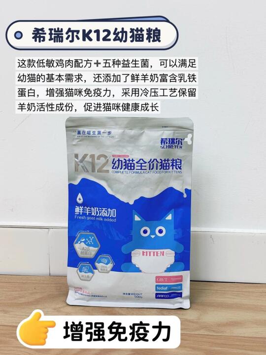 •希瑞尔幼猫粮:主要成分是鸡肉粉、鱼粉和马铃薯蛋白,蛋白质含量38%,添加了益生菌和益生元,帮助调理肠胃,但植物蛋白占比稍高,适合肠胃健康的猫咪。