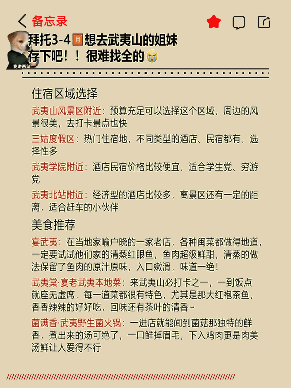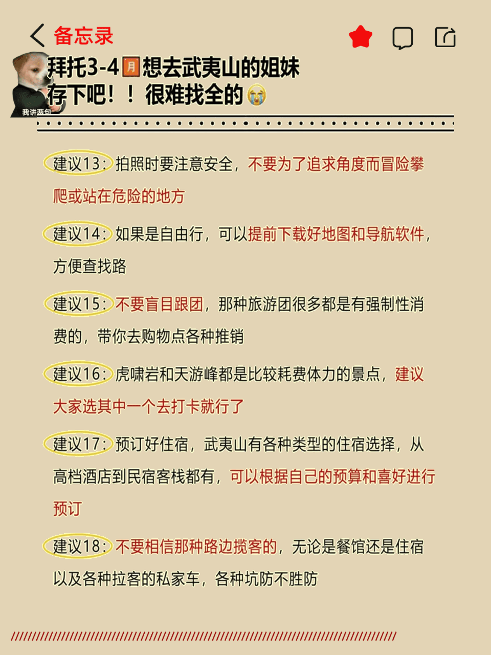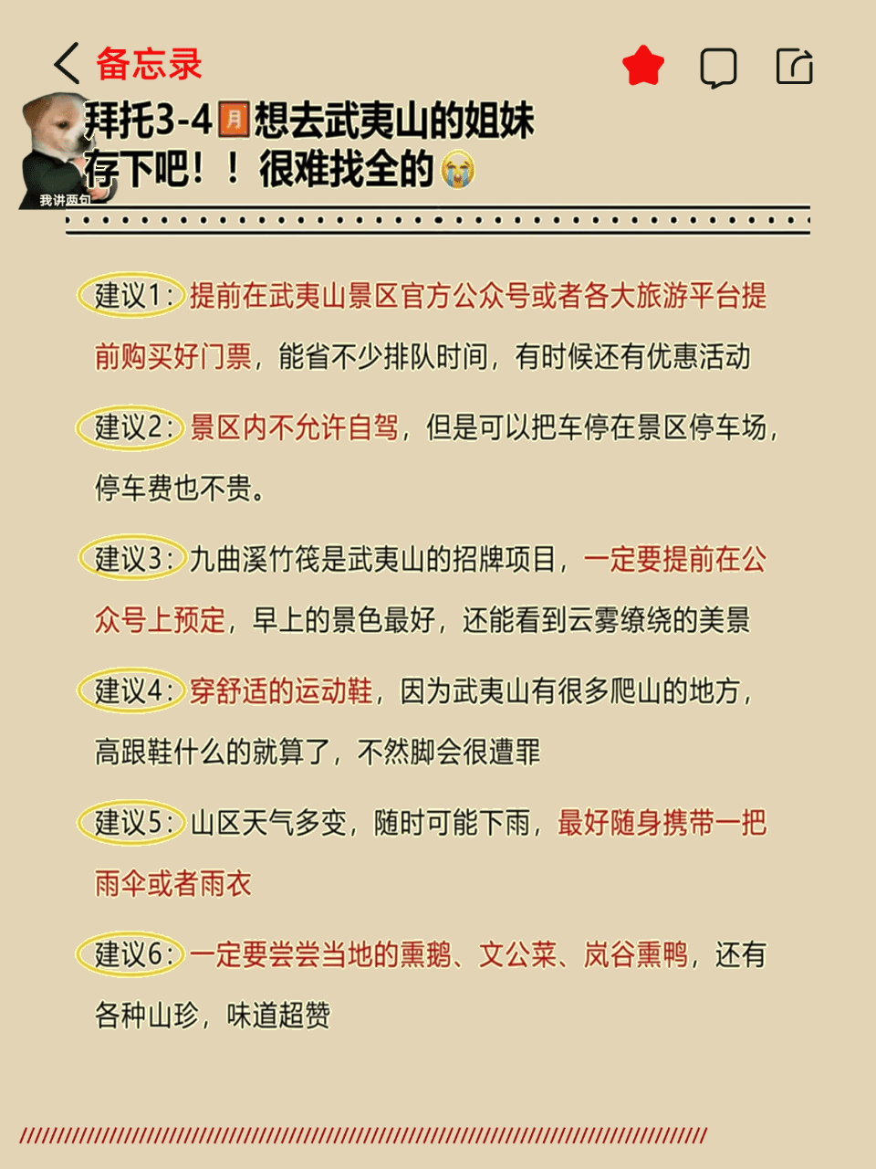 贴心建议📝 1️⃣ 提前在官方公众号或旅游平台买票,能省排队时间还可能有优惠 2️⃣ 景区内禁止自驾,可以把车停在免费停车场 3️⃣ 九曲溪是必打卡项目,建议预约早场,云雾缭绕超美 4️⃣ 穿舒适运动鞋,武夷山爬坡路段多,高跟鞋绝对不行 5️⃣ 随身带伞,山区天气多变 6️⃣ 必吃美食:武夷山的薰鹊、文公菜、岚谷薰鹊,各种野生菌都值得尝试 7️⃣ 买茶叶认准正规茶叶店,别被忽悠 8️⃣ 建议玩3-5天,慢慢体验更舒服 9️⃣ 天游峰、玉女峰都是拍照圣地,提前做功课 🔟 天游峰台阶陡峭,量力而行,别强撑 1️⃣1️⃣ 除了竹筏和爬山,还可以看印象大红袍演出 1️⃣2️⃣ 消费时注意查看价格,遇到宰客及时投诉