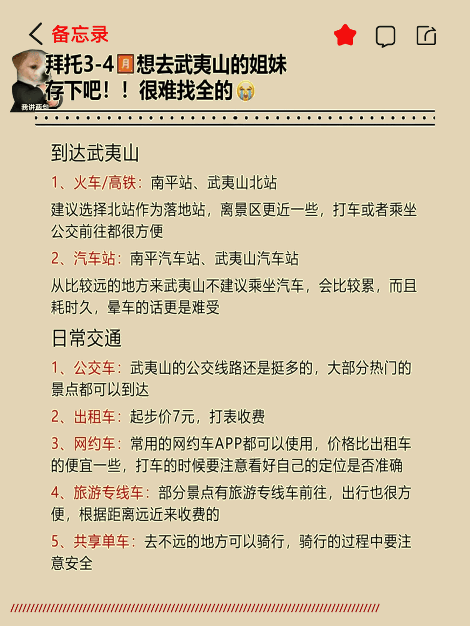 交通攻略🚆 🚉 火车/高铁:建议选择武夷山北站下车,离景区更近,打车或坐公交都很方便 🚌 汽车:从远途来的集美们不建议选择汽车,容易疲惫,尤其是暑期会更辛苦 🚗 日常出行: · 公交线路覆盖全面,能到大部分热门景点 · 出租车起步价7元,按表计费 · 网约车比出租车实惠,记得核对定位准确性 · 旅游专线直达部分景点,按距离收费 · 共享单车适合短途代步,注意骑行安全