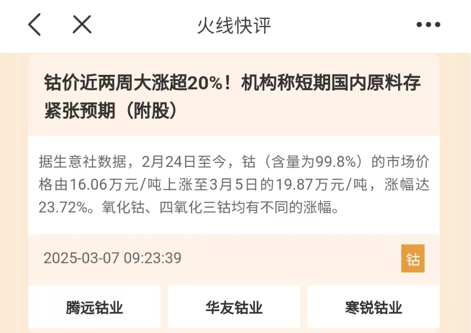 在每日经济新闻APP私人订制的“火线快评”中,3月7日开盘前提到钴价上涨这个消息,相关个股最近持续上涨。多位选手表示,大赛的福利真不错,只要报名比赛,就能免费查看火线快评。