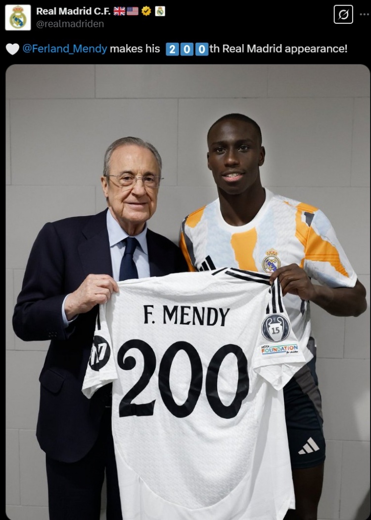 本场比赛也是门迪代表皇马各项赛事第200次出场,球队官方也晒出门迪与主席弗洛伦蒂诺的合照,祝贺他达成这一里程碑。