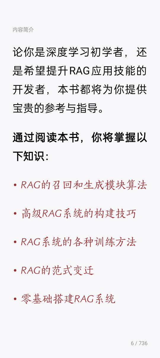书中不仅揭示了RAG技术背后的数学原理,还通过丰富的案例与代码实现,引导读者从理论走向实践,轻松掌握RAG系统的构建与优化。无论你是深度学习初学者,还是希望提升RAG应用技能的开发者,本书都将为你提供宝贵的参考与指导。