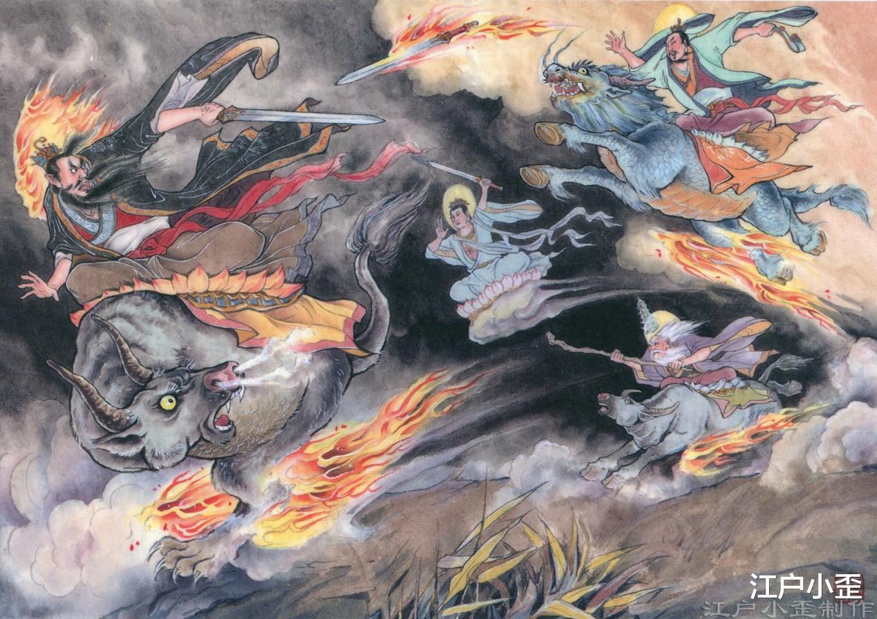 本文改编自封神演义中著名的大破诛仙阵,四圣协力打得通天教主狼狈逃窜。早年读封神演义的时候我觉得这段神魔乱舞很酷,各路仙人帮助正义的姜子牙打通天教主,大快人心。现在再读这段故事,反而对通天教主的悲惨遭遇深表同情。阐教和截教只是理念不合,谁更有理难以定论,正如武王和纣王谁才应该君临天下?最后拳头才是硬道理,胜者高举天意的旗帜,为自己的行为正名。
