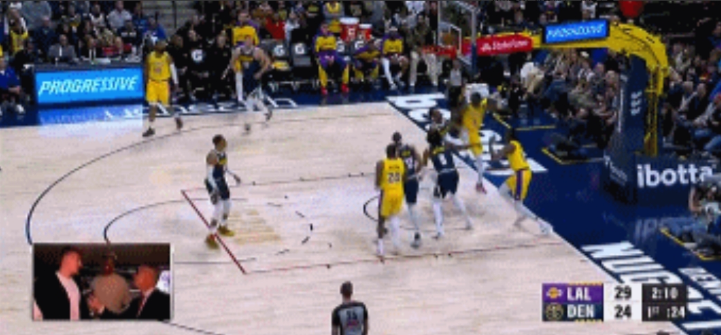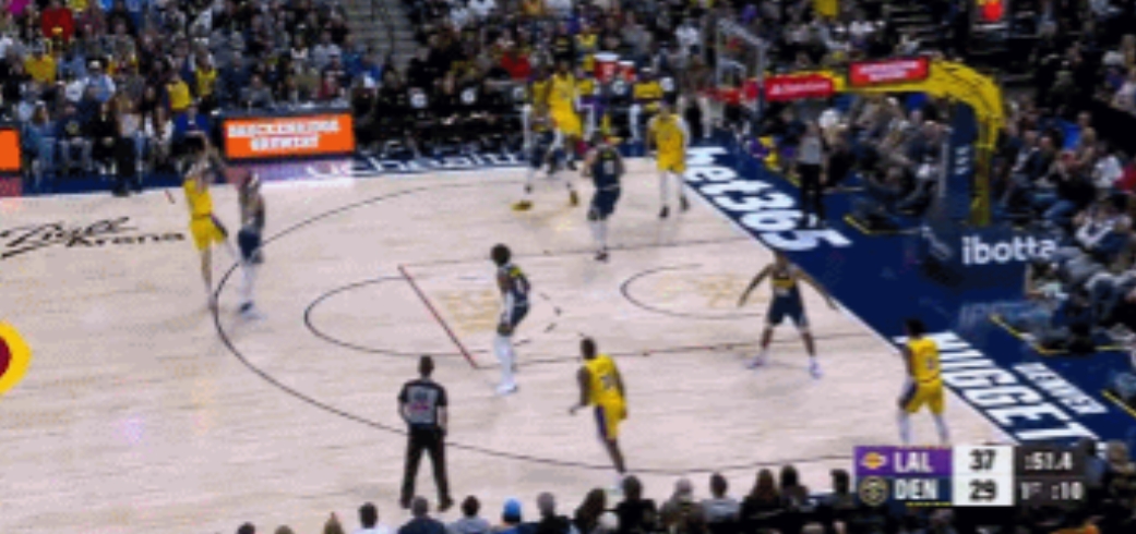 在湖人对阵掘金的第一节比赛里,里夫斯上线持球观察,布朗尼左侧底角埋伏,在沃特森上去夹击的瞬间,里夫斯传球布朗尼,后者接球后抬手就是一记三分球