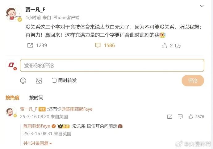 今天赛后贾一凡发文表示:“没关系这三个字对于竞技体育来说太苍白无力了,因为不可能没关系。所以我想:再努力!赢回来!这样充满力量的三个字更适合此时此刻的我”