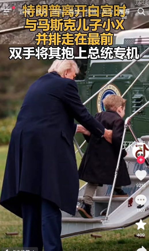 特朗普离开白宫时,与马斯克的儿子小X并非走在最前,甚至用双手抱他上了总统专机,这待遇也是马斯克小儿子独自享有。从特朗普的举动来看,这也就难怪为什么特朗普儿子巴伦每次看到马斯克不开心了,他儿子不止分走了他父亲一些宠爱,还可能成为将来从政的对手之一!