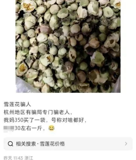 还有网友发现,街头售卖的“雪莲花”,其实只是普通的煲汤食材霸王花干。