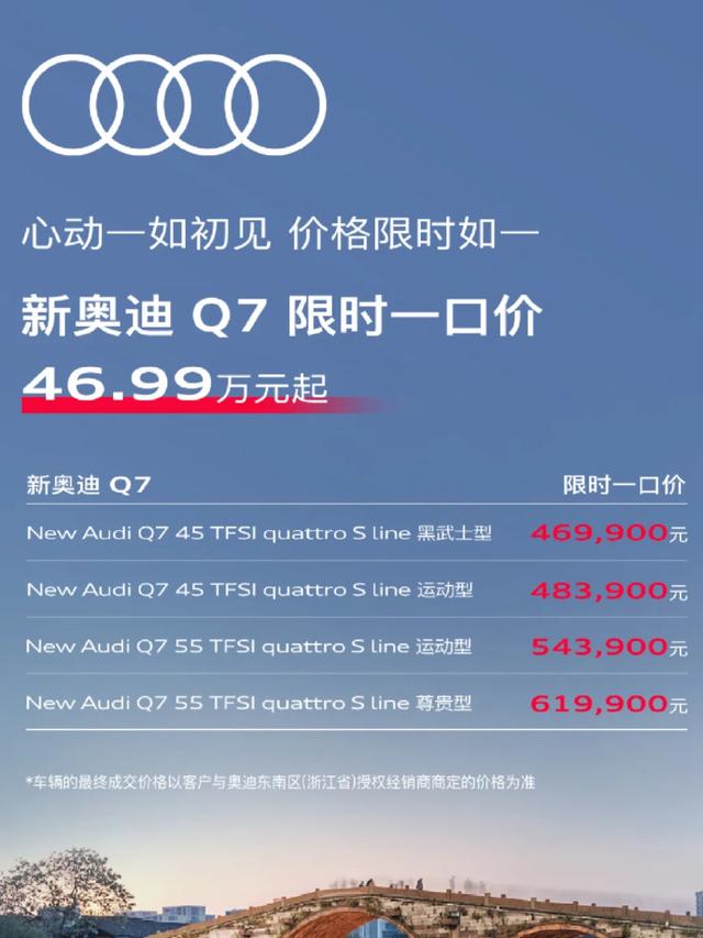 日前,奥迪北京区域和浙江区域先后发布价格海报,Q7的入门价格已经被压到了最低45.99万元的水平,配合1.5万元的置换补贴,相当于最低售价来到了44.49万元的水平,这个价格已经相当于奥迪Q5 2.0T高功率车型的厂商指导价了。虽然相比于60.98万元的起售价,Q7的降价幅度好像并不多,但是从终端起售价来看,44万多的确已经相当低了。
