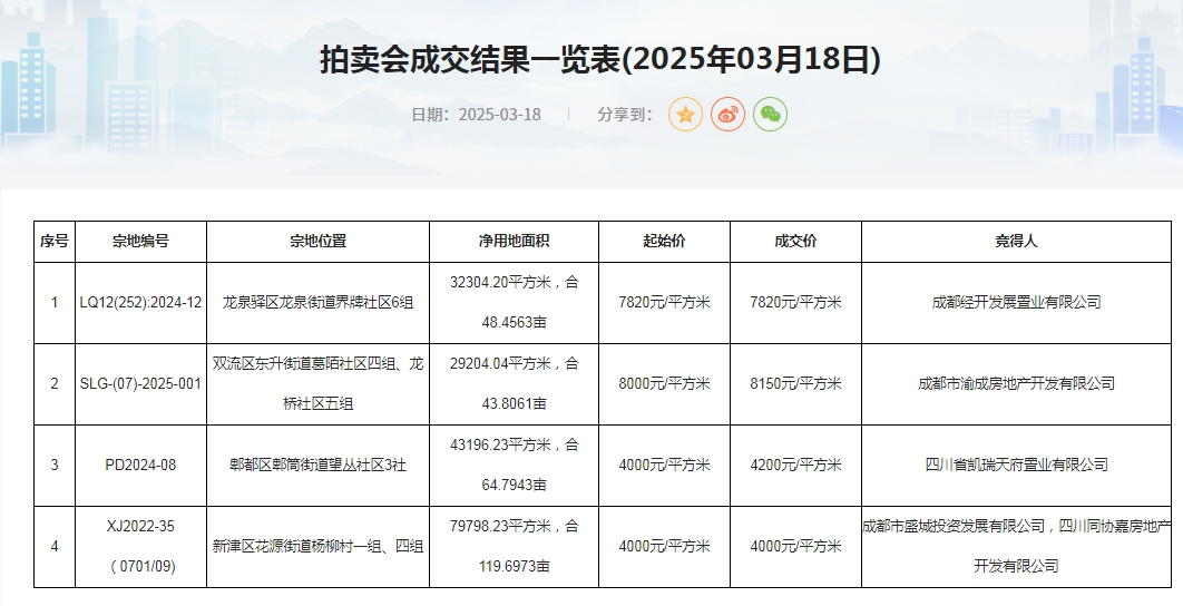 3月18日,龙泉驿、郫都、双流、新津各一宗土地拍卖,全部成功拍出,底价,低溢价成交是主流。