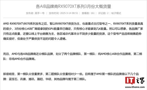 3月18日的消息显示,根据某知名硬件论坛在本月14日的爆料,RadeonRX9070系列显卡目前面临GPU供应不足的问题。与此同时,AMD对其合作伙伴进行了品牌梯队的划分,以确保资源分配的优先级。