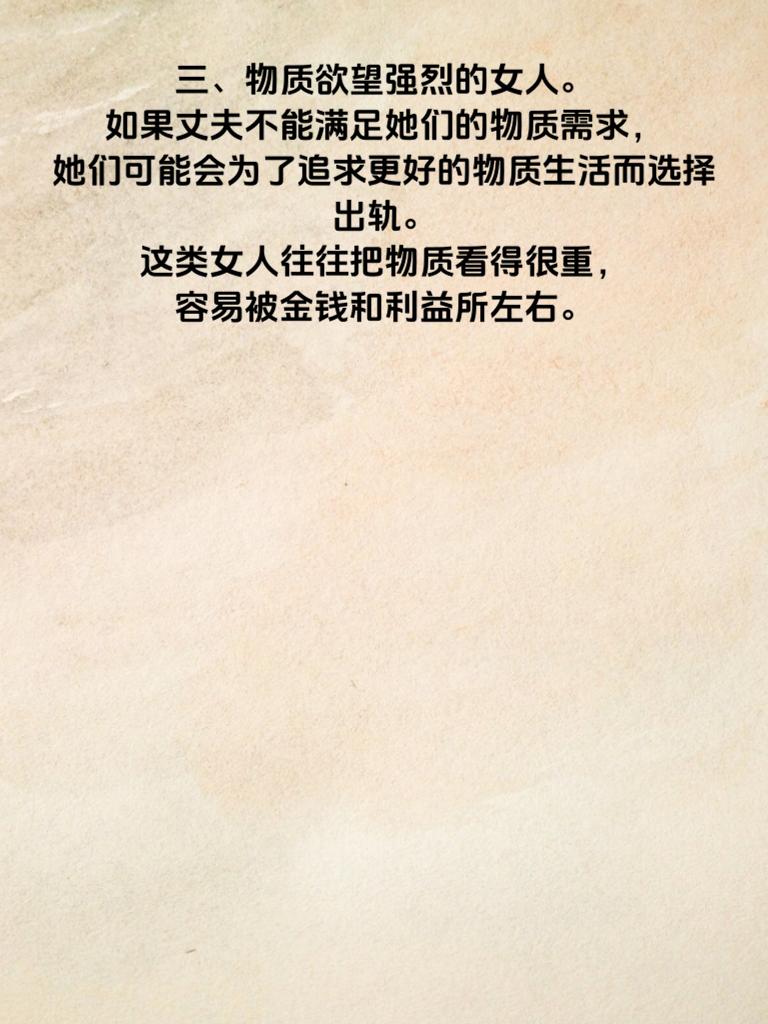 一、过于独立的女人。她们在婚后可能会因为缺少陪伴而感到孤独,从而容易被外界的诱惑所吸引。她们有自己的事业和生活圈子,对丈夫的依赖程度较低,当遇到能给予她们更多关注和陪伴的人时,就容易出轨。 二、缺乏沟通的女人。如果夫妻之间长期缺乏有效的沟通,彼此之间的理解和信任就会逐渐消失。这类女人可能会在心里积累很多不满和委屈,当遇到能倾听她、理解她的人时,就容易出轨。 三、物质欲望强烈的女人。如果丈夫不能满足她们的物质需求,她们可能会为了追求更好的物质生活而选择出轨。这类女人往往把物质看得很重,容易被金钱和利益所左右。