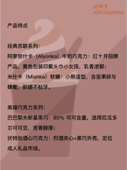 品牌以“守护甜蜜传统,创新俄罗斯风味”为核心理念,承载了苏联至俄罗斯联邦的百年糖果文化,产品覆盖巧克力、软糖、焦糖等品类,出口至全球 50 多个国家。
