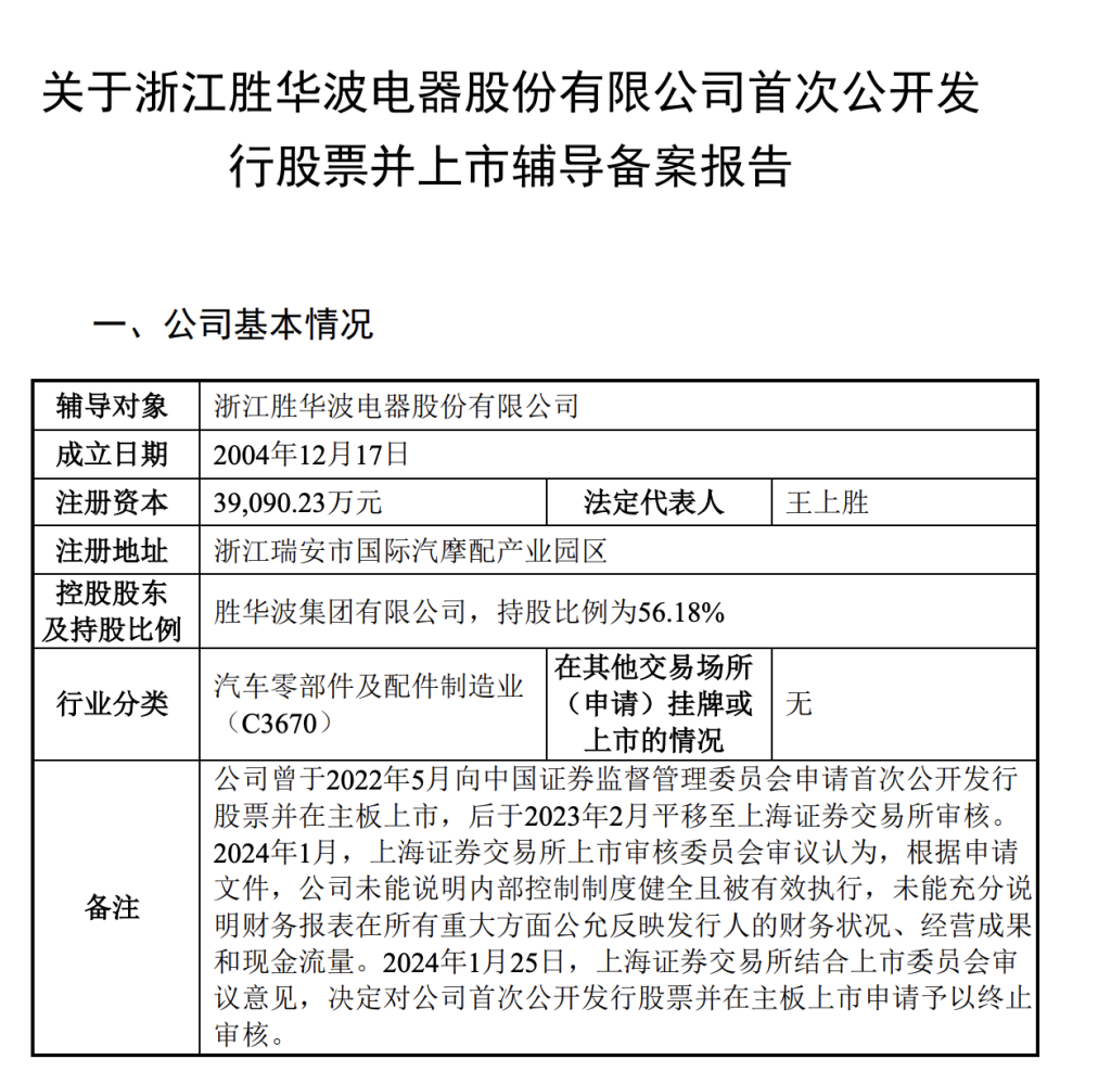 2025年3月18日,浙江证监局公告,浙江胜华波电器股份有限公司(简称“胜华波”)IPO辅导备案登记获受理,保荐机构为海通证券。