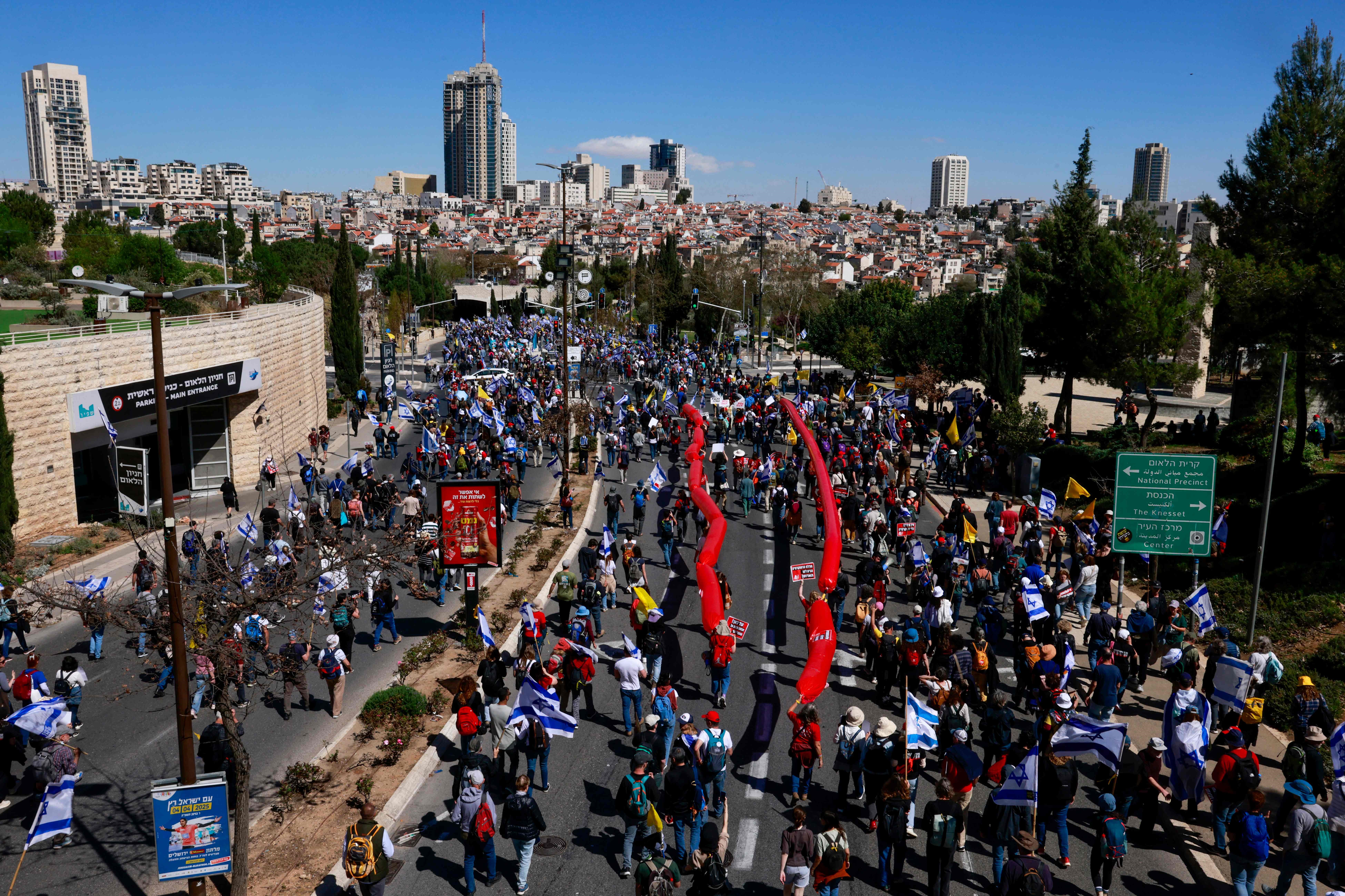 3月19日,以色列抗议者在耶路撒冷举行反对内塔尼亚胡政策的示威活动。(法新社)
