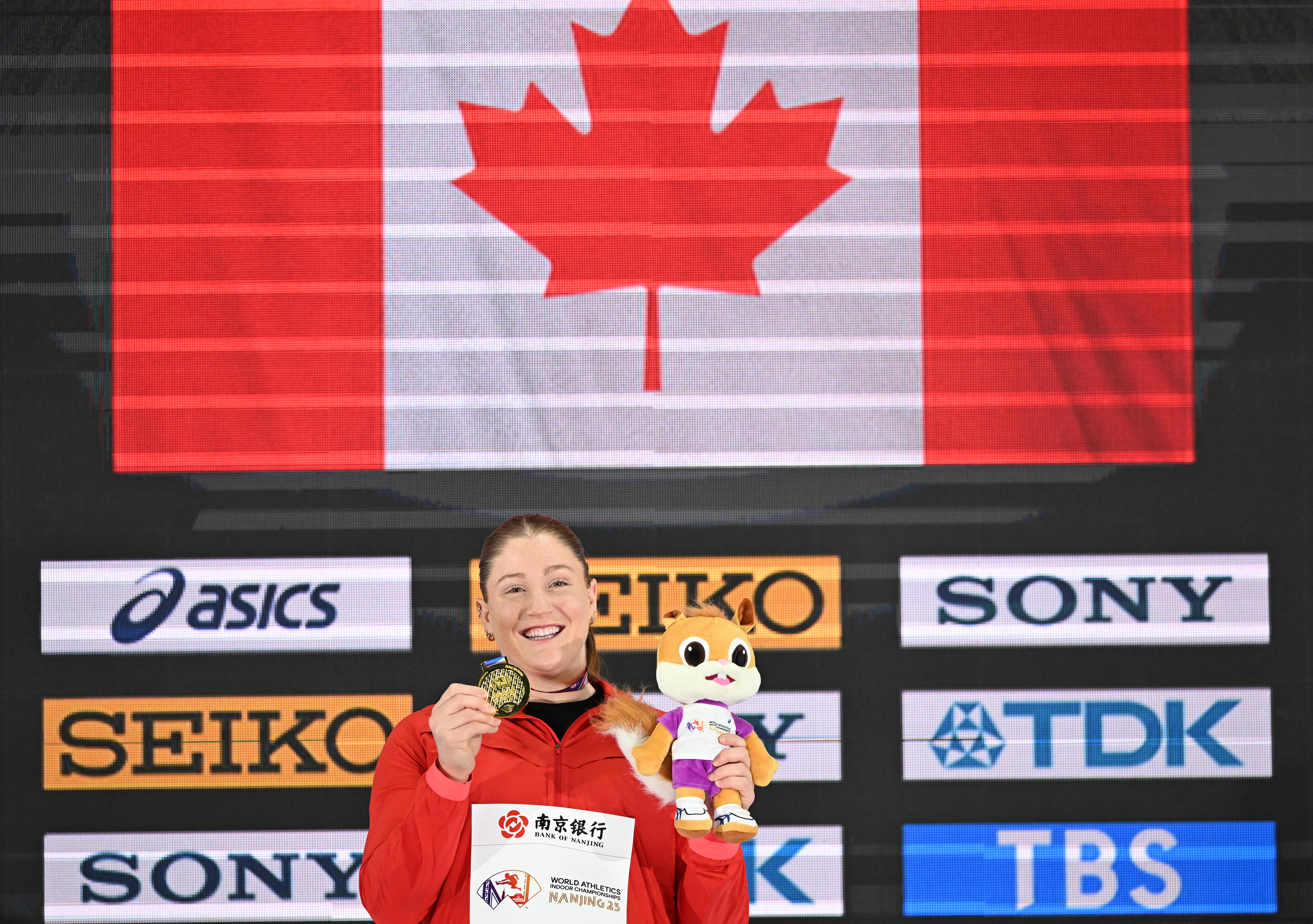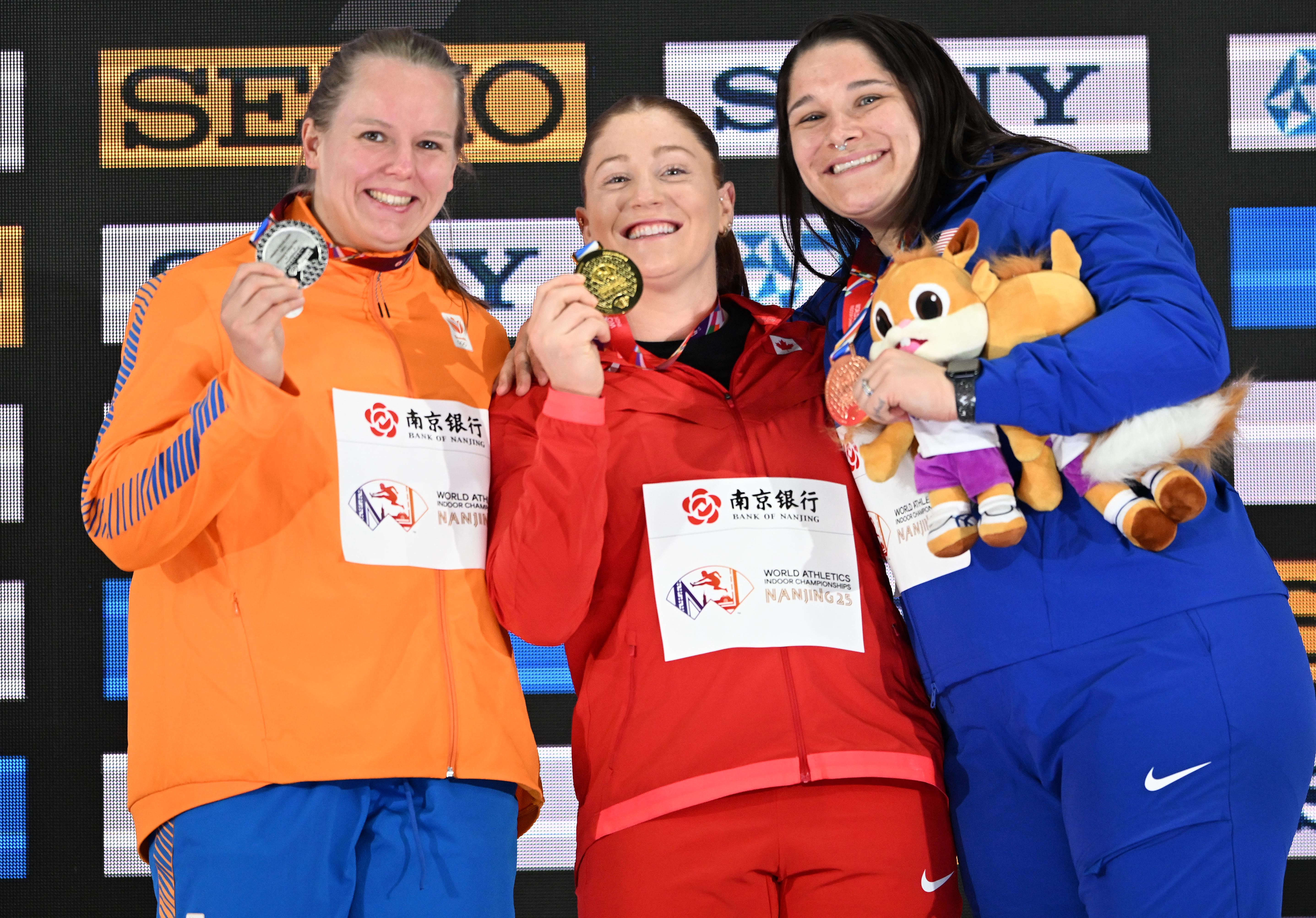 当日,2025南京世界田联室内锦标赛女子铅球颁奖仪式举行。
