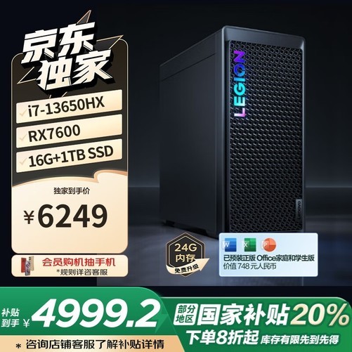 这款台式机外观为黑色,简约大气又不失时尚感。其在京东的原价为6249元,现在有诸多优惠活动。有满999元减10元的优惠券,还能参与立减31.24元的活动,更有国补1241.55元的优惠。如果叠加满2000减100元的优惠券,下单1件时,最终到手价低至4966.21元。这个价格就能把这款高性能的游戏台式机带回家,对于游戏爱好者或者需要高性能电脑办公的用户来说是个不错的选择。