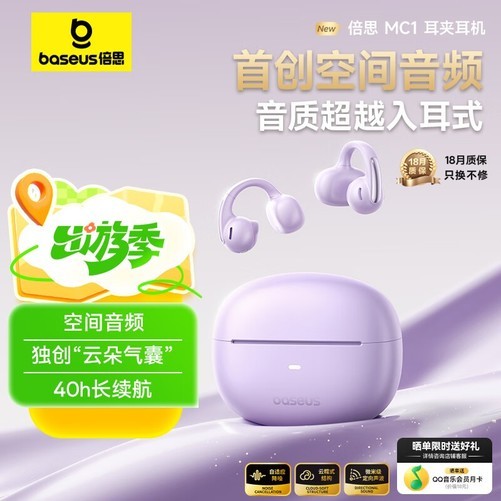 倍思MC1小云朵骨传导蓝牙耳机是一款极具特色的耳夹概念开放式无线耳机。它采用夹耳式的设计,不入耳,这种独特的设计非常适合运动跑步时使用,既不会因为入耳式耳机的堵塞感而难受,又能稳固地佩戴在耳朵上。而且,它还具备通话降噪功能,能让你在通话过程中享受清晰的声音,不受外界噪音干扰。该耳机为时尚的紫色。
