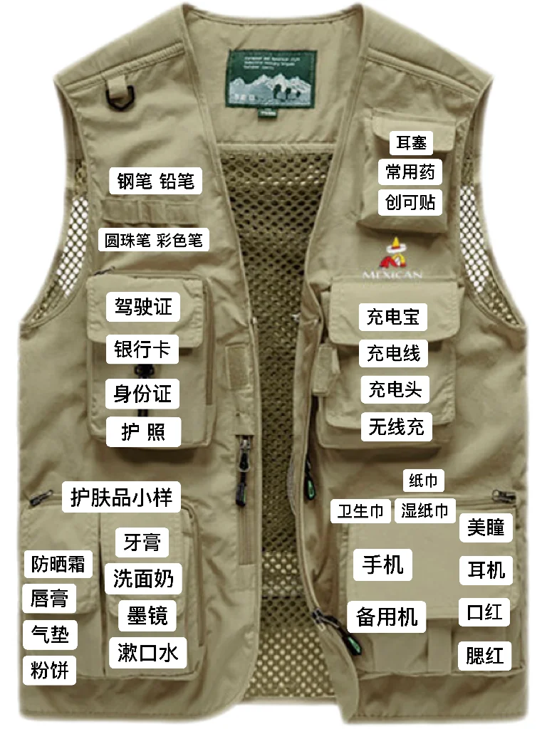 旅游、爬山、拍照的时候也都能用,穿在身上就拥有了要啥有啥的安全感,随时从对应口袋里掏出证件、补妆用品,跟钓鱼佬一样气定神闲。