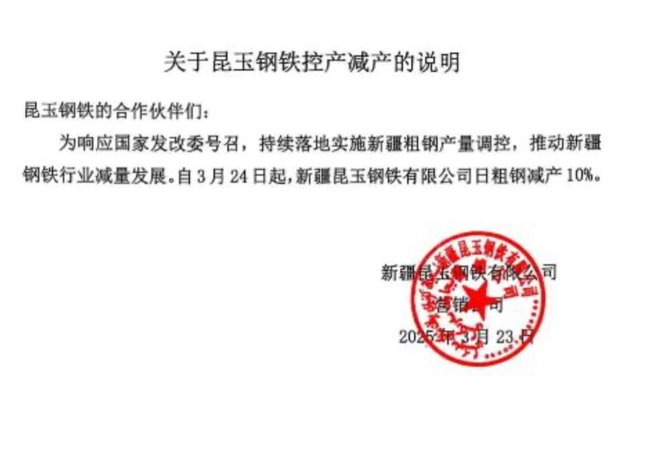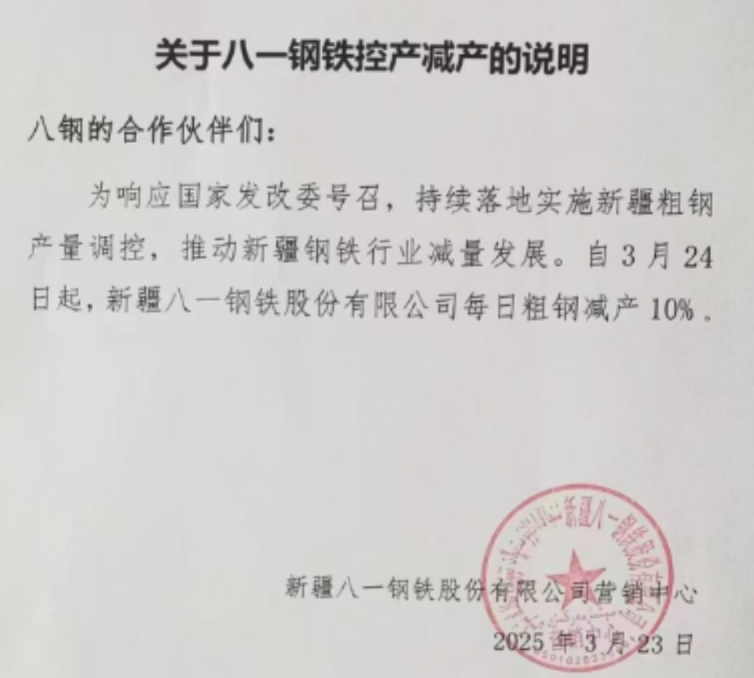 为响应国家发改委号召,持续落地实施新疆粗钢产量调控,推动新疆钢铁行业减量发展。自3月24日起,新疆八一钢铁股份有限公司每日粗钢减产10%。