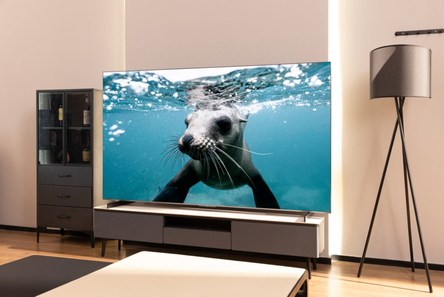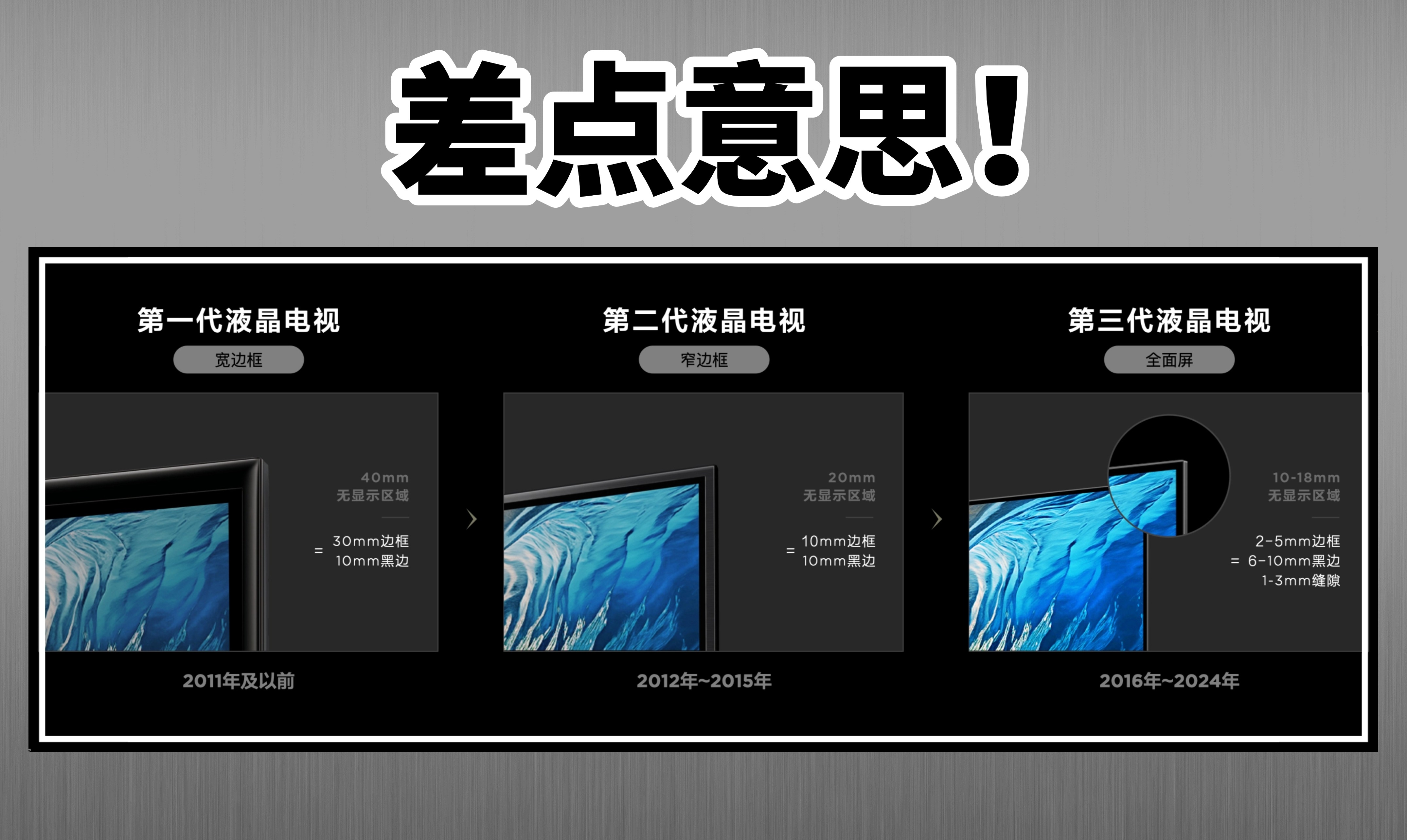 咱就说,从液晶电视诞生起,边框和黑边可以说是“老大难”问题了。回想以前的液晶电视,第一代可视面积也就87%左右,第二代能到93%,后来到了现在号称“全面屏”的第三代可视面积撑死也就95%-97%。虽说屏占比是一直在涨,但始终没做到真正的“全面观看”,边框加黑边再加缝隙,前前后后差不多有10-18mm呢,这看起电视来,还是不够美观,也不够沉浸。