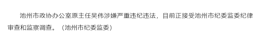 池州市政协办公室原主任吴伟涉嫌严重违纪违法,目前正接受池州市纪委监委纪律审查和监察调查。