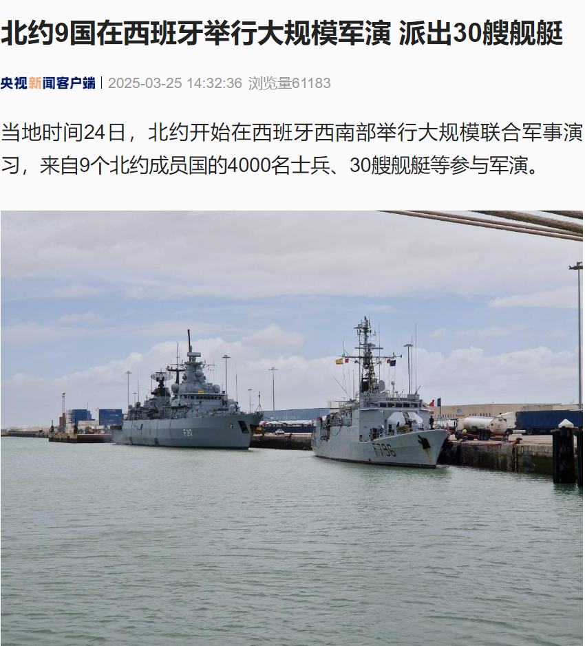 据央视新闻,当地时间3月24日,北约开始在西班牙西南部举行大规模联合军事演习,来自9个北约成员国的4000名士兵、30艘舰艇等参与军演。