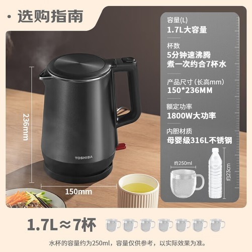 东芝KT-17DRTC电热水壶,采用316L医用级不锈钢内胆,健康耐用,不易产生水垢,让每一口水都更加纯净。1.7升大容量设计,满足家庭或多人使用需求,一次烧水足够全家人饮用。温控精准,快速沸腾,防烫设计更安全,无论是泡茶还是冲奶都能得心应手。