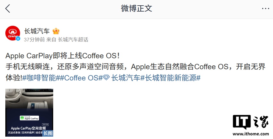 据长城汽车官方介绍,苹果Apple生态将自然融合CoffeeOS,CarPlay支持手机无线瞬连、还原多声道空间音频等能力。IT之家附重点内容如下: