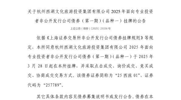 3月27日,上交所发布关于杭州西湖文化旅游投资集团有限公司2025年面向专业投资者非公开发行公司债券(第一期)(品种一)挂牌的公告。