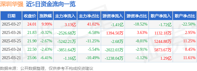 证券之星消息,深圳华强3月27日涨停收盘,收盘价24.01元。该股于9点51分涨停,未打开涨停,截止收盘封单资金为1.49亿元,占其流通市值0.59%。