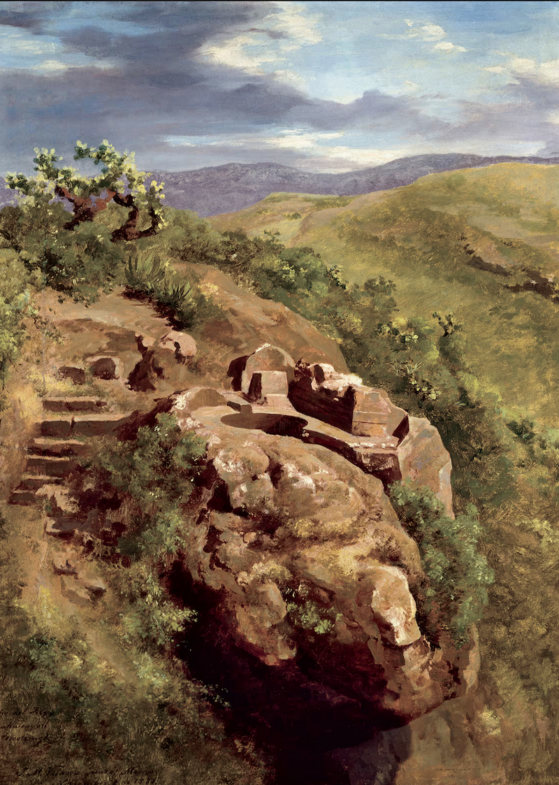 如果眼前的风景是棕色或沙漠黄,那么贝拉斯科也会表现出来。他在1878年创作的油画《内萨瓦尔科约特尔国王的浴场》(TheBathsofKingNezahualcoyotl)是对古代遗迹的一种非浪漫主义的描绘。他坚持认为,考古学是在破碎的碎片中看到神奇,而非印第安纳·琼斯式的探险。他在对这个前哥伦布遗址的精确描述中,展示了难以解读的砖石碎片和一段古老的台阶。