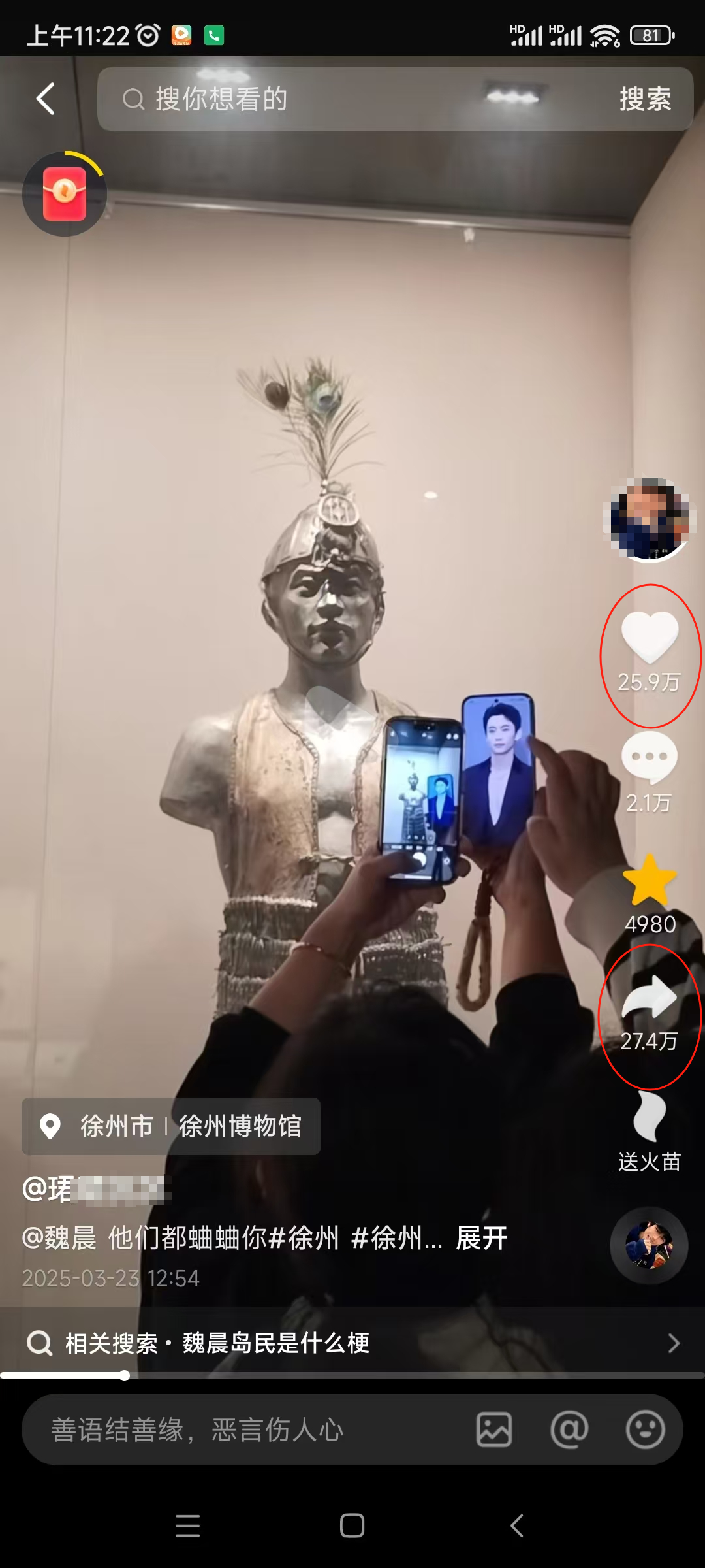 “魏晨,他们都蛐蛐(记者注:网络语言,意思为小声议论)你。”近日,徐州的陈小姐(化名)在徐州博物馆拍摄的一段视频火了,视频中有游客拿着魏晨照片和一尊雕像拍照,只因该雕像神似歌手魏晨。视频引发了25.9万人点赞27.4万人转发和2.1万人评论。