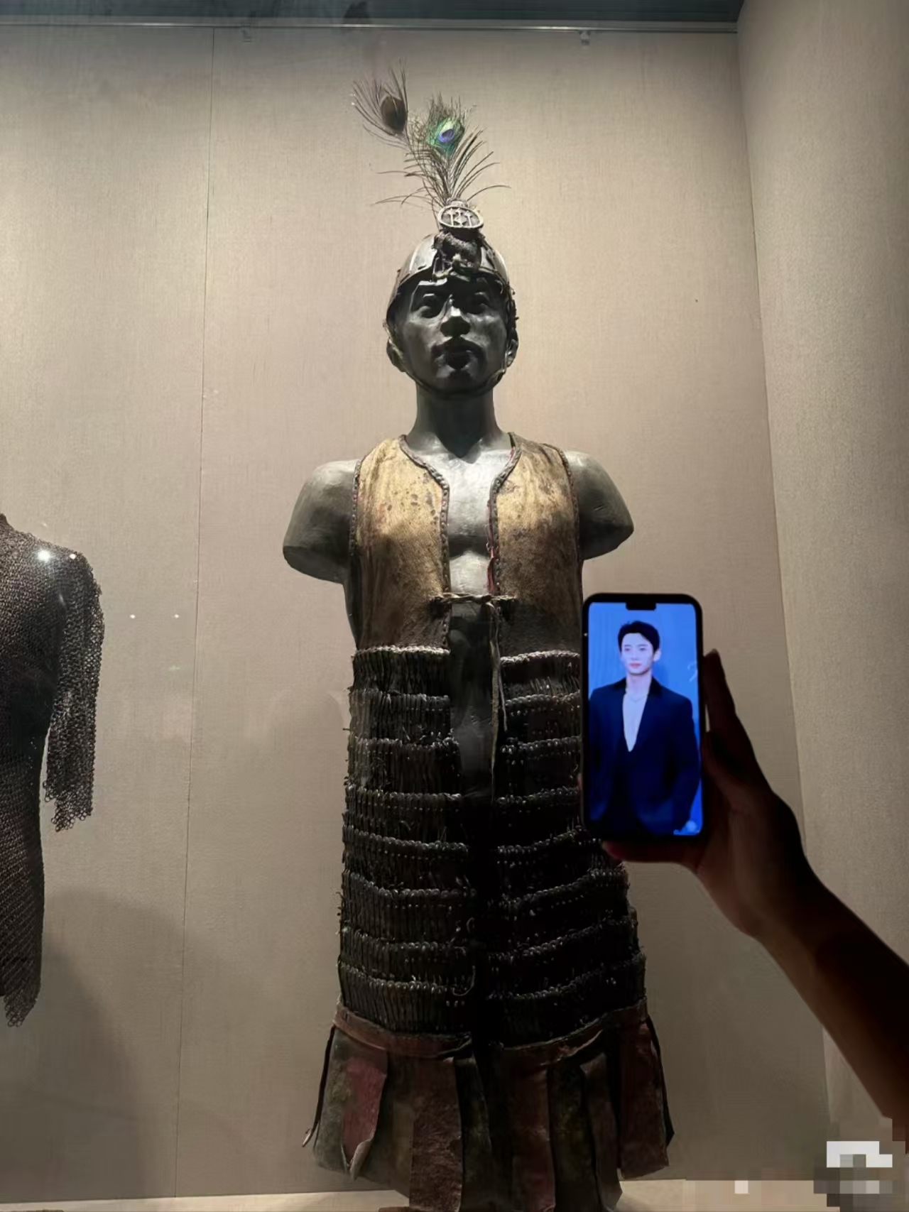 就雕像的具体来历,工作人员透露:“这只是一个没有任何意义的摆架,跟木头块一样,上面展示的是一件元代的甲衣,上面是皮革做的,下面是铁片做的,这种在中原地区是比较少见的。”