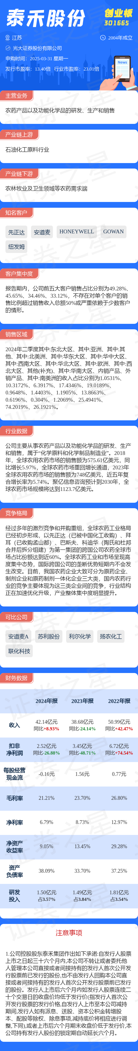 证券之星消息,泰禾股份3月31日网上申购,申购代码为301665,中签号公布日期为4月2日。该股概况请见下图: