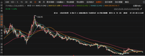 与上市公司业绩大幅“变脸”对应的是股价的波动。2022年7月,锂价见顶前,天齐锂业股价一度达到136.95元/股(前复权),总市值超过2200亿元。截至3月28日午间收盘,天齐锂业报30.58元/股,总市值仅剩502亿元,中间缩水了超1700亿元。