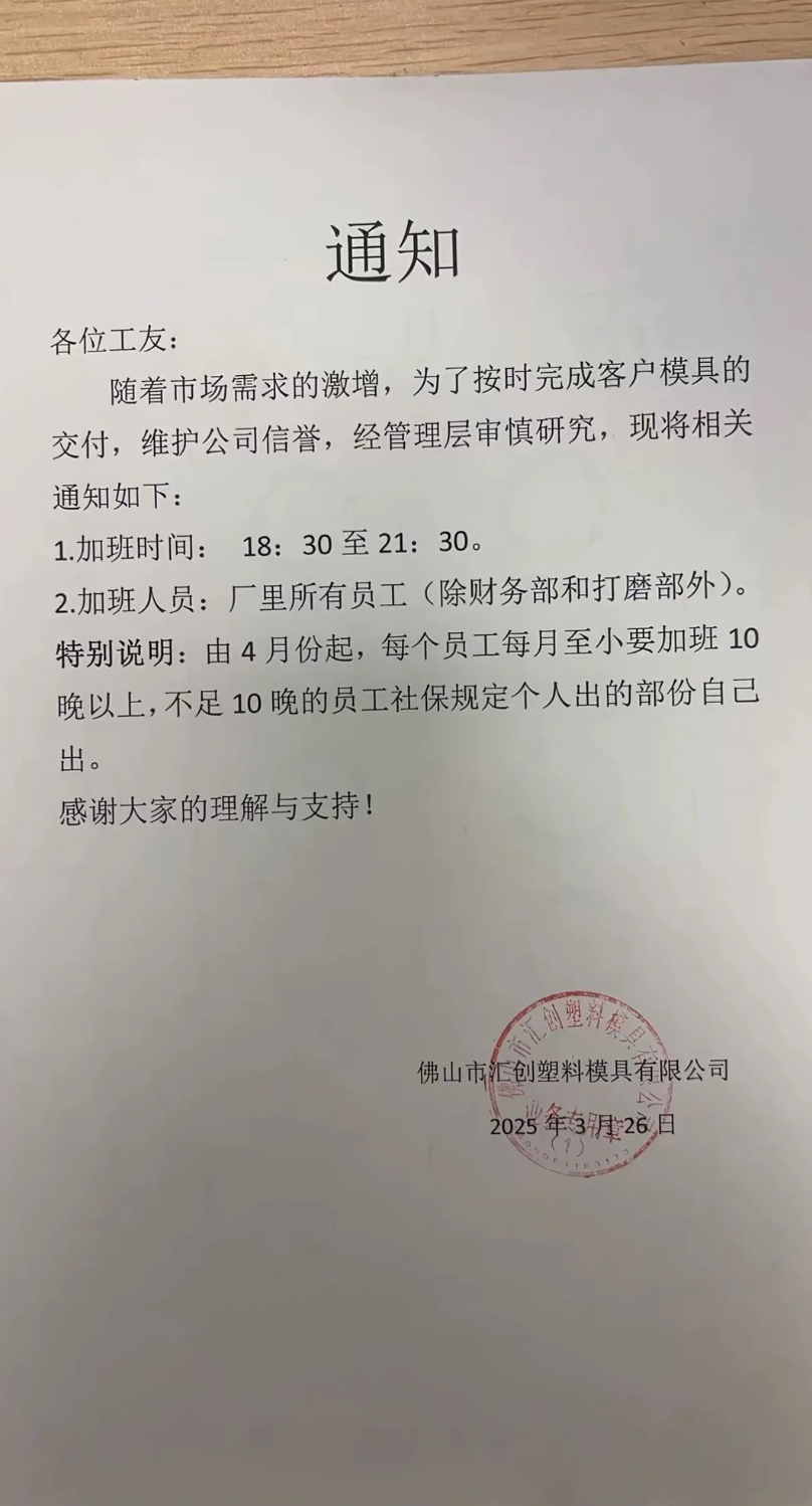近日,网曝佛山汇创塑料模具有限公司发通知称,要求员工每月至少要加班10晚。