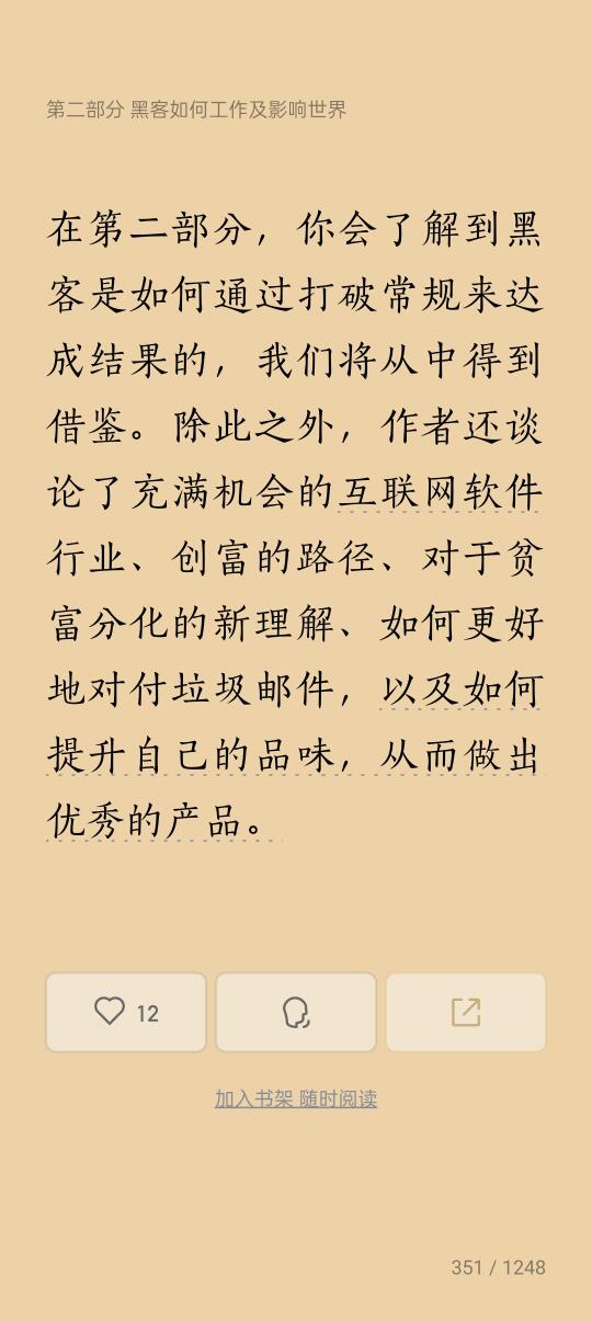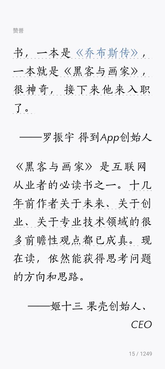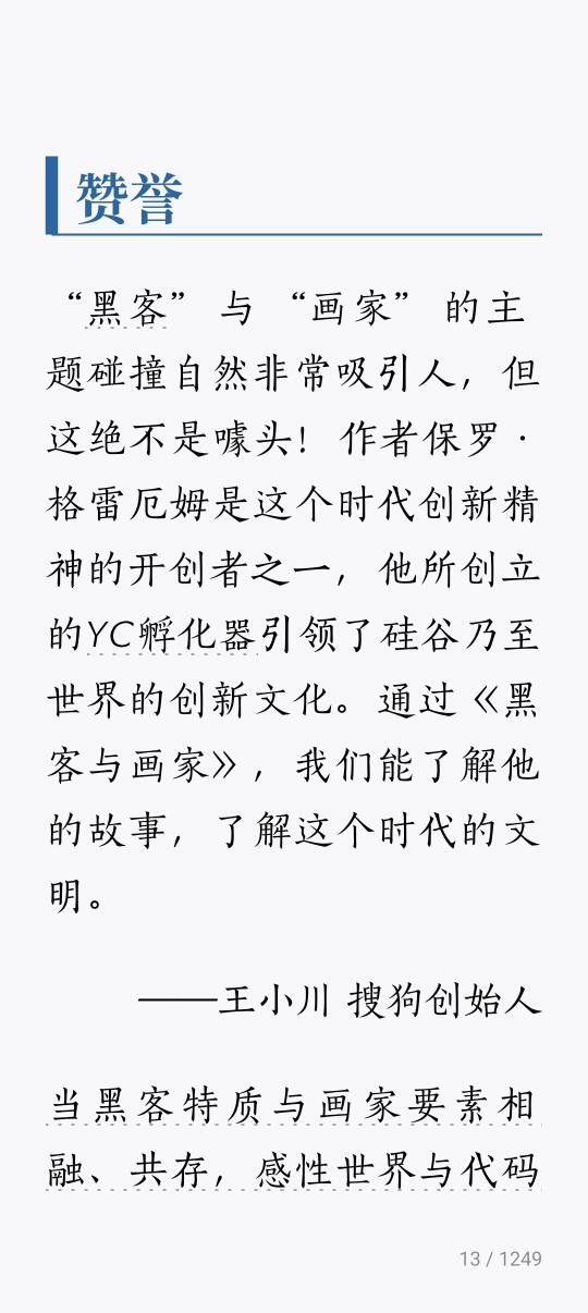 I事实上,在全部15篇文章中,保罗所探讨的内容远远超出了黑客所关注的内容,并以幽默的笔触,在最广泛的可能性上展现了他对于人人关心且受其影响的重大议题的思考。不管是创造财富,还是如何设计出好产品,抑或如何在充满了异见的世界里自洽地活着。可以说,不管我们处在人生的什么阶段,都将从阅读本书的过程中得到启示。
