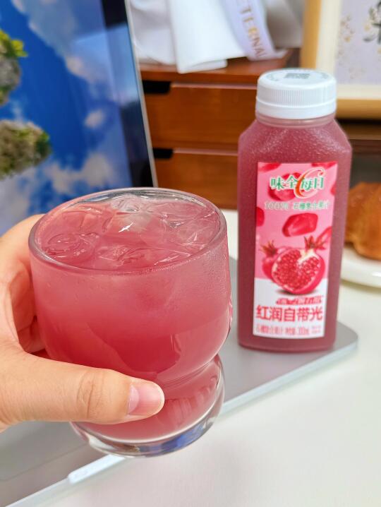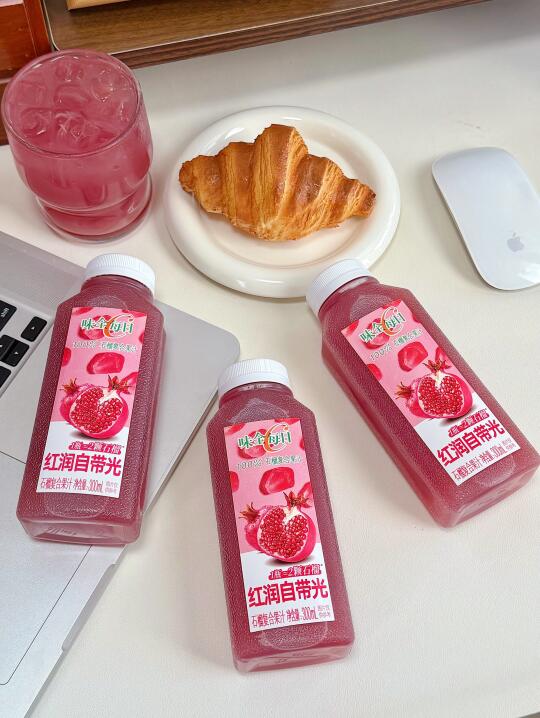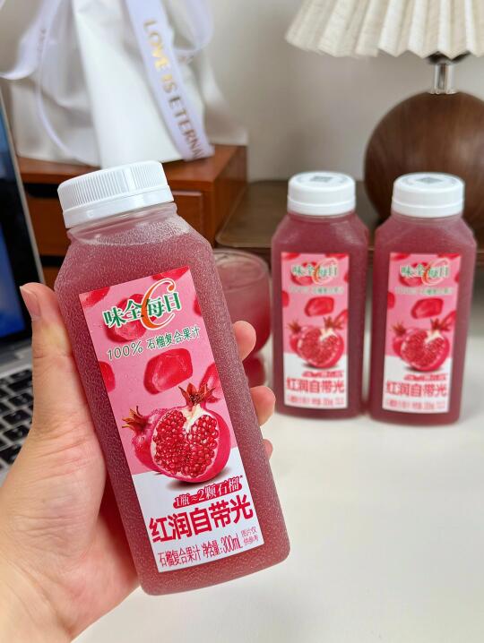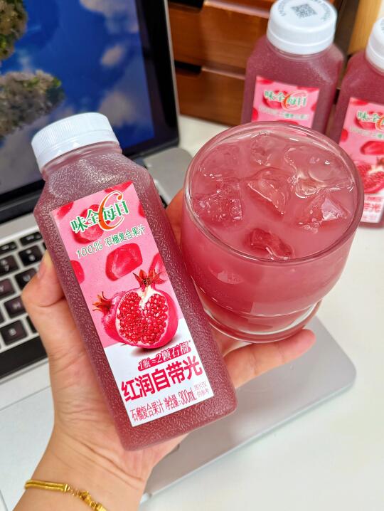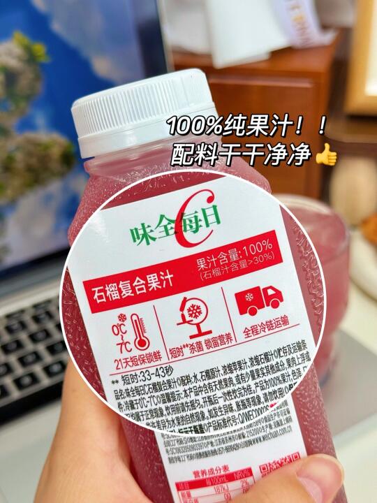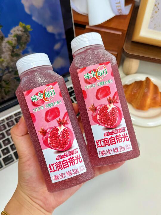 味全每日C石榴汁,建议打工人把奶茶都换成它!! 味全每日C竟然出了新口味石榴汁!! 真是悄咪咪干大事,喝一口就惊艳了!! 甄选突尼斯软籽石榴,籽软汁多 榨出来的果汁口感纯正浓郁,满口都是石榴的清甜果香~ 大口吨吨吨好快乐…冷藏喝更爽口!! 100%纯果汁,1 瓶约等于 2 颗石榴!! 石榴的营养价值大家都知道的吧? 富含VC和花青素,各位女孩子们多喝!! - 早上搭配面包,营养丰富又好喝!! 每天都想来一瓶,配料干净,减脂期也可以喝!! 味全每日C真不愧是国内冷藏纯果汁的佼佼者,夸夸~