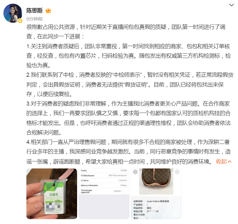很抱歉占用公共资源,针对近期关于直播间包包真假的质疑,团队第一时间进行了调查,在此同步一下进展: