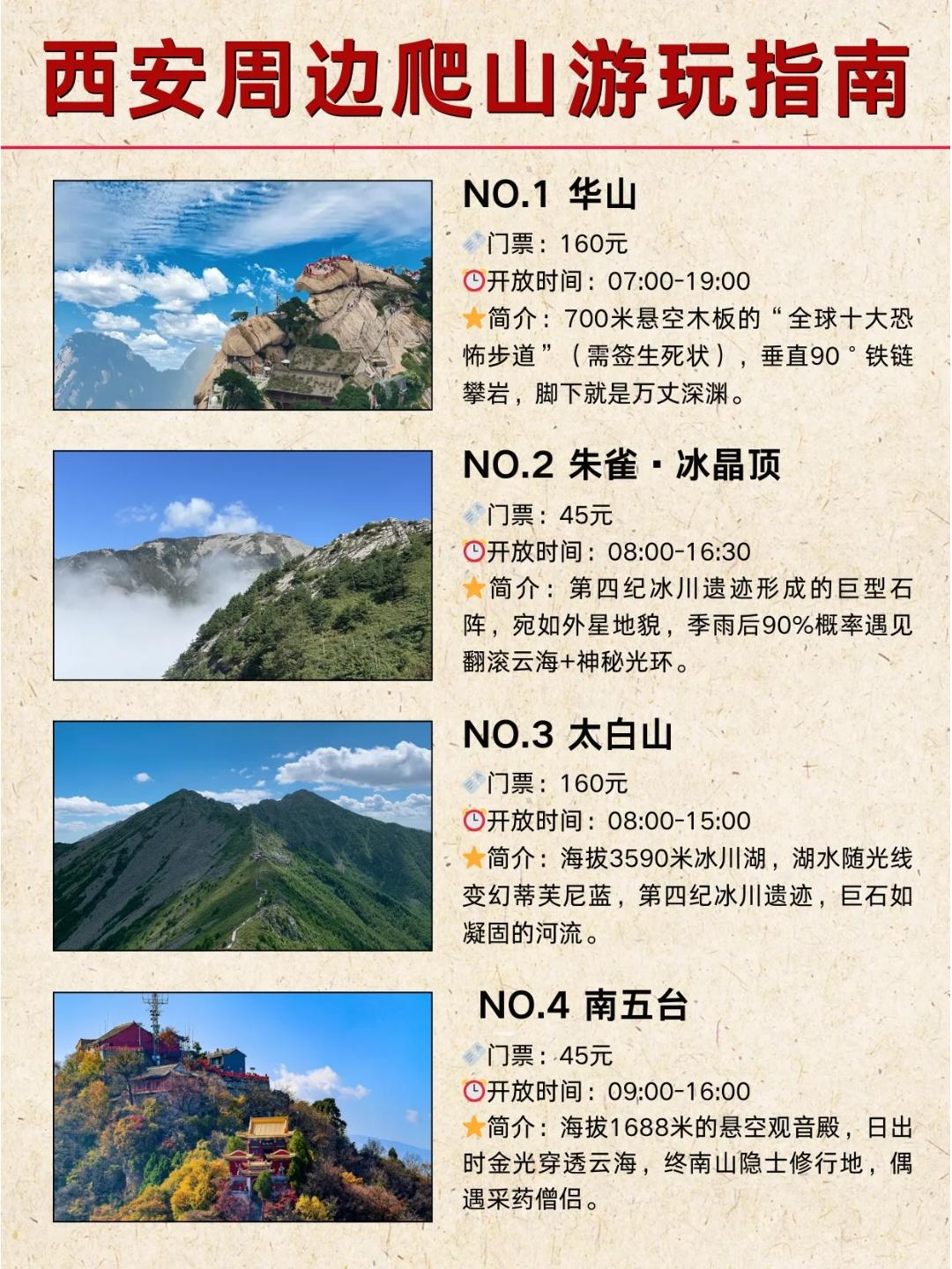 🌱西安周边爬山鄙视链,放心冲冲冲!。秦岭,横亘华夏大地的山脉,四季皆美,以下是2025年四季徒步爬山路线,脉,领略大美秦岭! . ✅小白踏春赏花: ①.三凤山⭐⭐⭐ 📍蓝田九间房镇,春季漫山遍野的连翘花、桃花 穿越路线,全程约12km,爬高700m ②黄峪寺⭐⭐⭐ 📍长安区翠微山下,春日白鹃梅山花烂漫 穿越路线,全程约13km,爬高700m ③蓝关古道⭐⭐⭐ 📍蓝田县蓝关镇,春日漫山连翘花、白鹃梅 全程约11km,爬高800m ④子午古道⭐⭐⭐ 📍长安区子午古道,4月上旬赏白鹃梅 全程约11km,