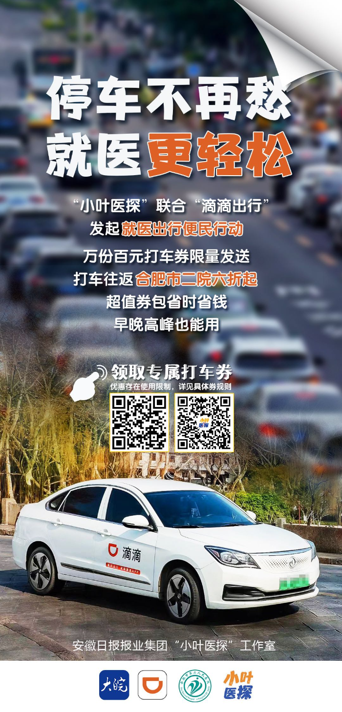 大皖新闻讯"停车难"一直是困扰患者就医的痛点。为了改善患者的就医体验,即日起,大皖新闻"小叶医探"联合滴滴出行发起"医路畅通"公益活动,限量发送万份百元打车券,读者可享最高六折打车优惠。