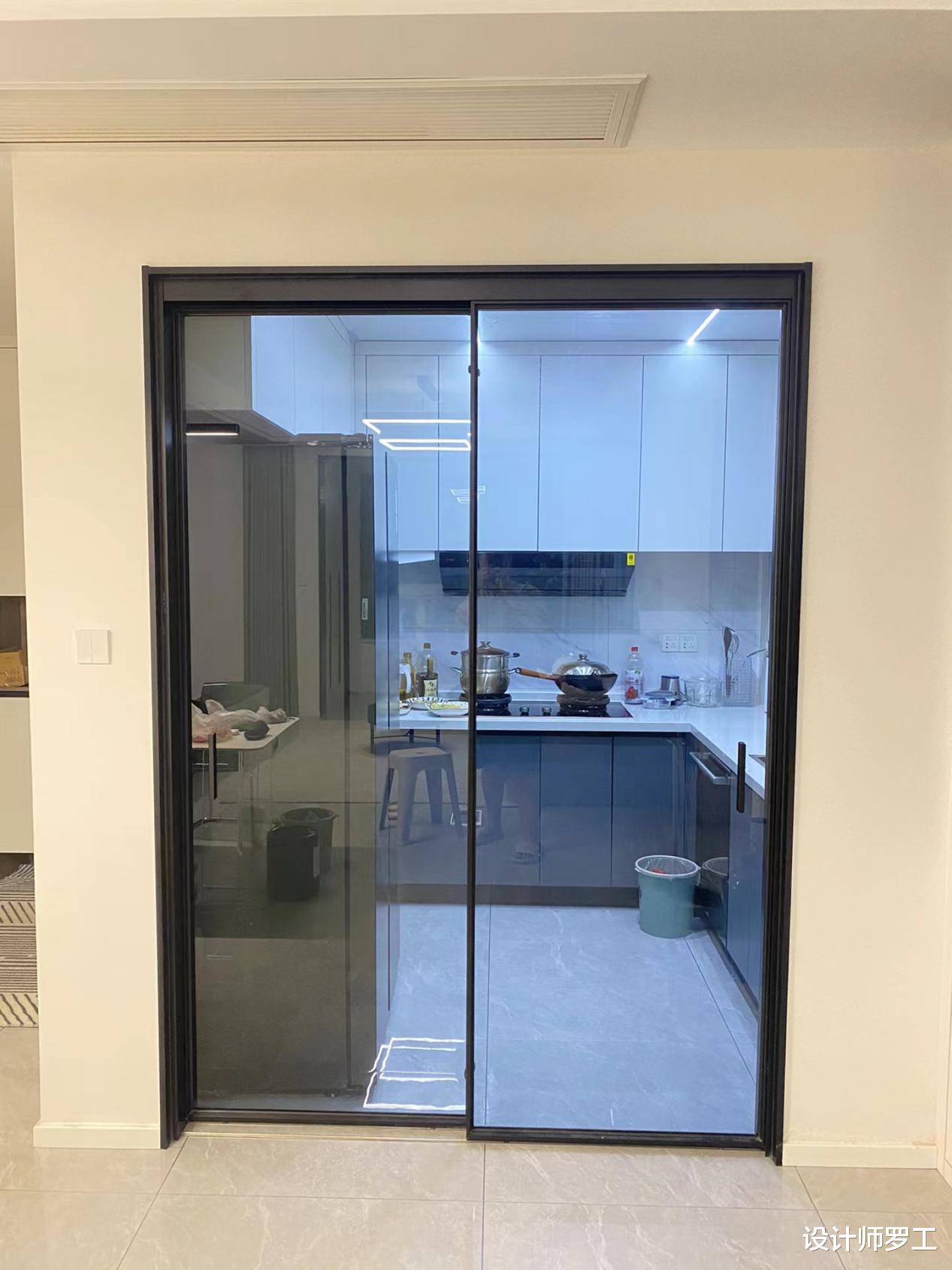 06厨房不装两扇趟门,装三扇联动门厨房门洞宽度一般在1.6米左右,如果做两扇趟门,进行的宽度不到80厘米,体积大的冰箱都搬不进去。