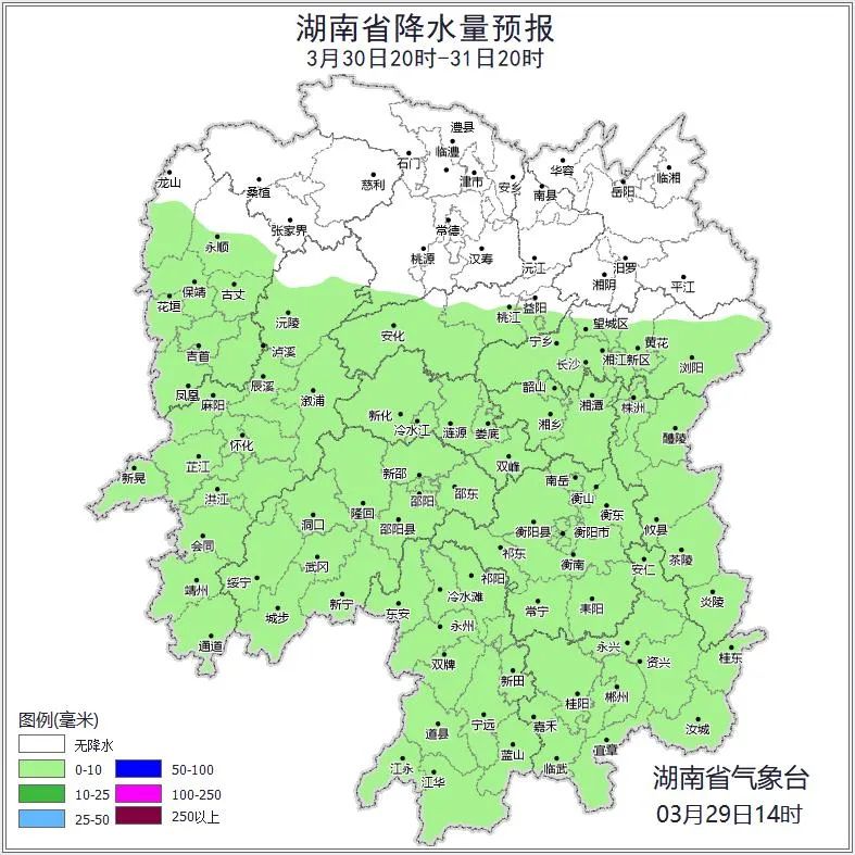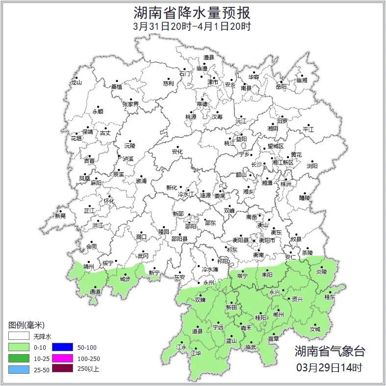 今晚(3月29日),受强冷空气持续影响,全省以小雨为主,湘中、湘南局地中到大雨;30日至31日,省内云系较多,湘中、湘南仍有弱降水发生;4月1日,全省天气转好;31日和4月1日早晨,湘西北局地有雾。