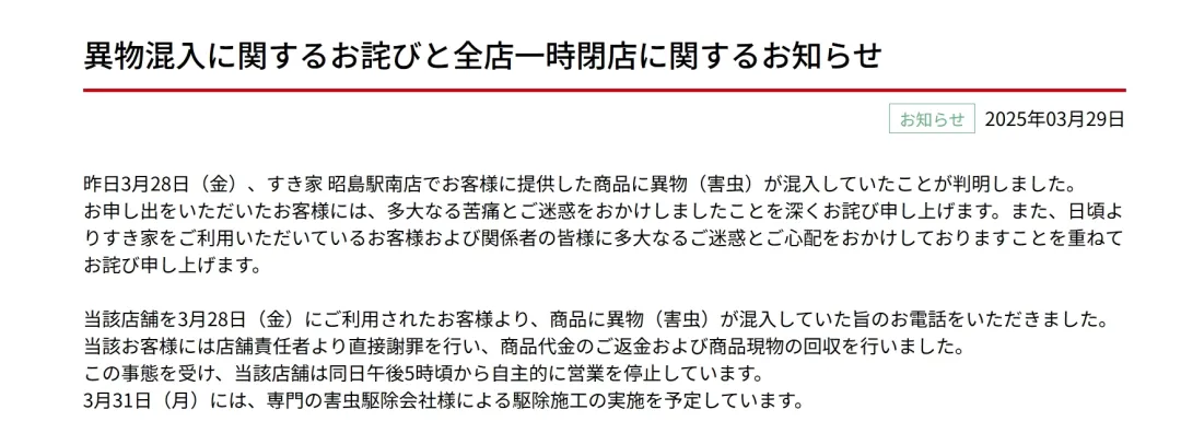 日本最大牛肉饭连锁店食其家周六在官网刊出声明,宣布由于近期日本门店接连出现客户在味噌汤、餐食中发现“异物混入”,从下周一开始日本全国近2000家门店中的大部分(除部分购物中心内门店外)将临时停业4天,以实施彻底的消杀措施。