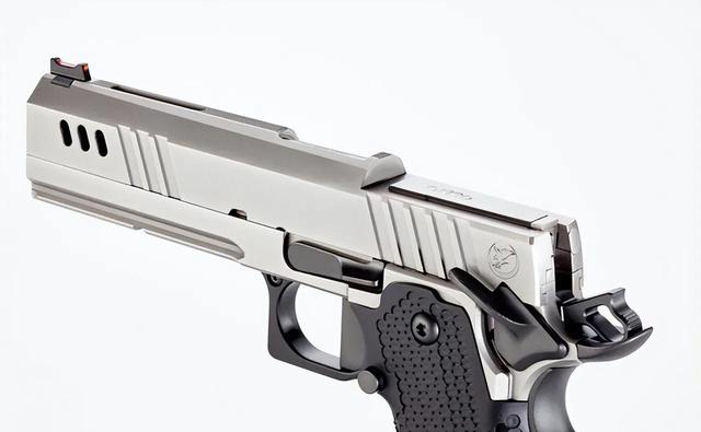 这一款外形新颖独特的竞技型手枪整体重1203克,这种质量比起一般都手枪算是重多了。该枪大部分部件皆采用不锈钢材料制作而成,采用的枪型为传统的M1911A1的改进型。光滑细腻的不锈钢套筒在前后两端都设计有风格粗犷的防滑纹路,枪口的前端还开有减重槽,用于射击时产生的消除焰火或者枪口制动之用。