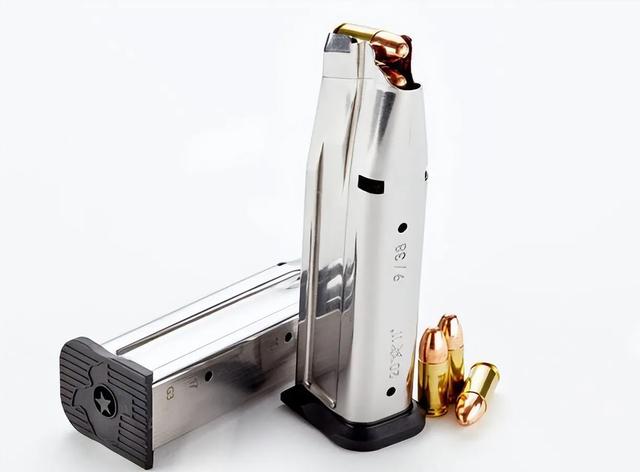 这种夜鹰定制版本的手枪的弹匣为双排双进型式,弹容量最高可以达到13发,甚至更多,在射击竞技中可以拥有着不俗的射击延续性,该枪的弹匣插口采用的也是可以快捷更换弹匣的喇叭型设计。弹匣解脱杆制造的外形也比较大,以便于使用者进行操作。