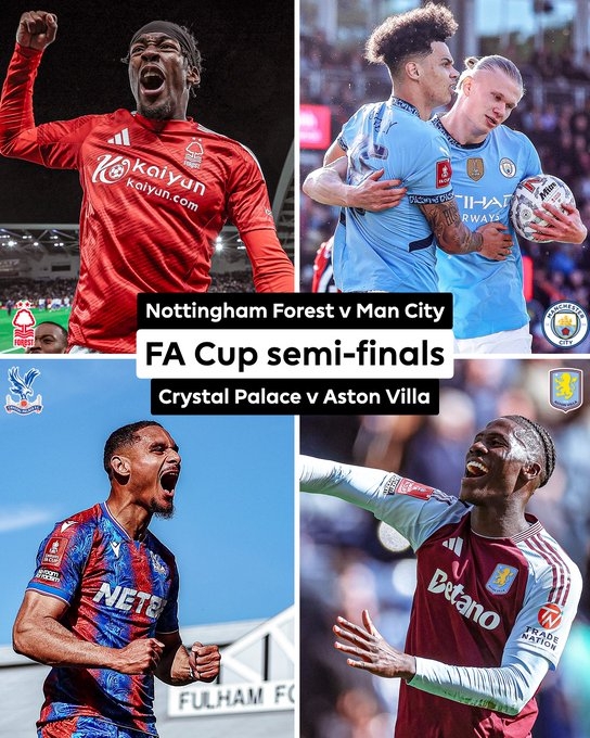 至此,足总杯4强对阵出炉:曼城vs诺丁汉森林,水晶宫vs维拉。