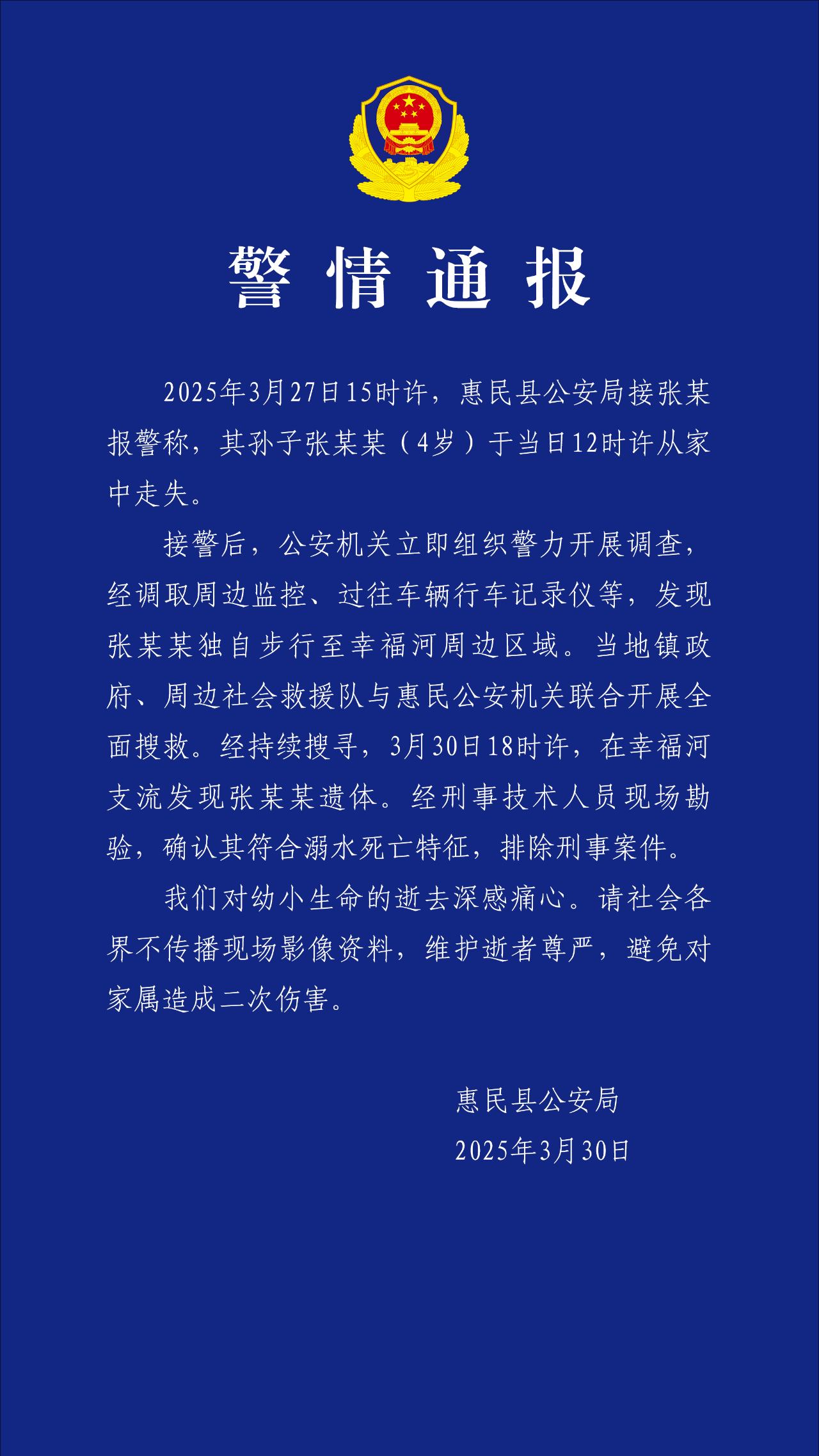 山东滨州惠民县警方通报,3月27日15时许,惠民县公安局接张某报警称,其孙子张某某(4岁)于当日12时许从家中走失。接警后,公安机关立即组织警力开展调查,经调取周边监控、过往车辆行车记录仪等,发现张某某独自步行至幸福河周边区域。当地镇政府、周边社会救援队与惠民公安机关联合开展全面搜救。经持续搜寻,3月30日18时许,在幸福河支流发现张某某遗体。经刑事技术人员现场勘验,确认其符合溺水死亡特征,排除刑事案件。
